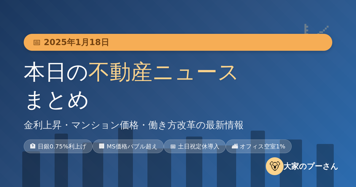 おはようございます!大家のプーさんです🐻 今日も不動産投資家の皆さまに役立つニュースをお届けしますね。年明けから金利動向やマンション価格の話題が盛りだくさんで、僕も毎日チェックが欠かせません! 📰 ニュース①|日銀、12月に追加... -