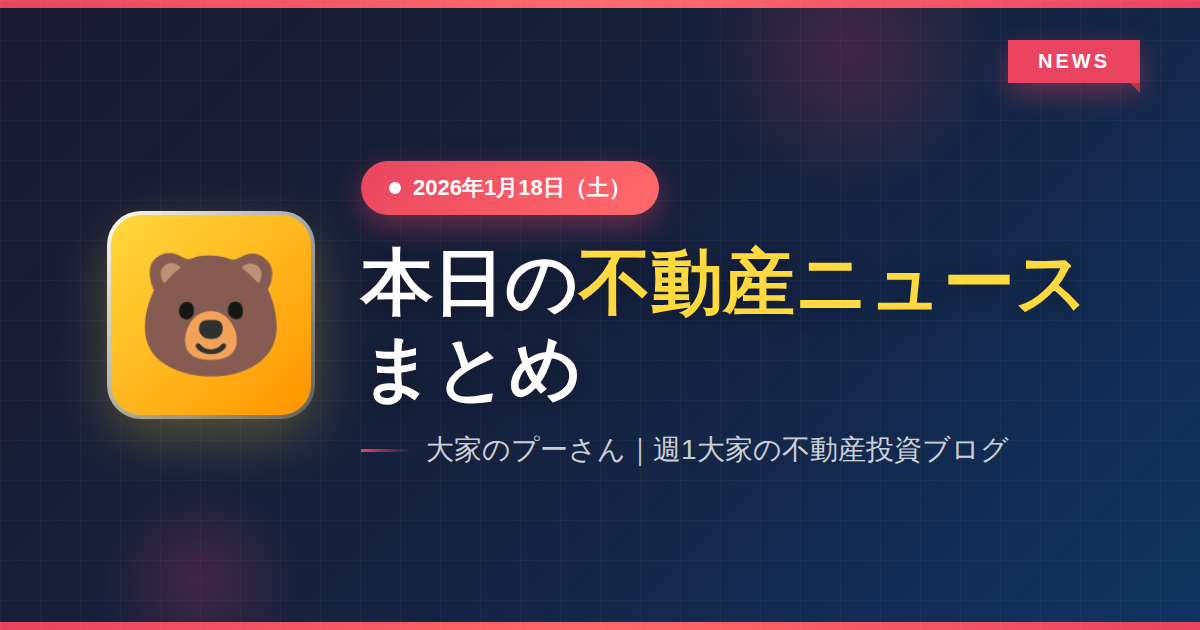 eyecatch_20260118ダウンロード 本日1月18日の不動産ニュースまとめ|大家のプーさん 皆さま、こんにちは!大家のプーさんです🐻 今日も不動産業界の気になるニュースをピックアップしてきました。 金利上昇、マンション価格、働き方改革…今日も盛...